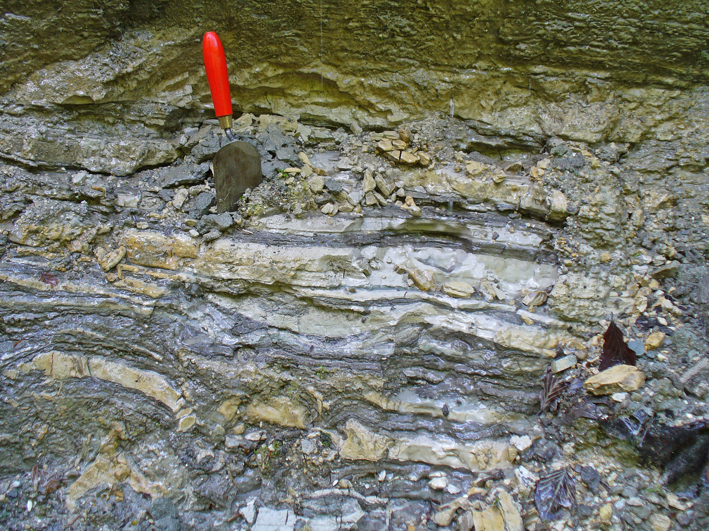 Mittelwürmzeitliche, periglaziale Seeablagerungen mit einer durch Setzungs- und Entwässerungsprozesse gestörten Wechsellagerung von dunkleren Ton- und helleren Kalkmudden (Nesseltalgraben NNE Unterau bei Berchtesgaden, BY, Foto: G. DOPPLER, 2015) |